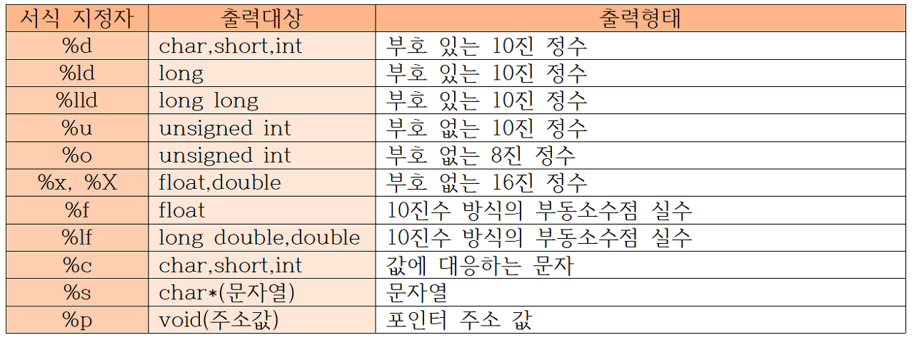 - printf, scanf 사용시 " " 내부에 각 자료형에 맞는 지정자를 % 뒤에 써주어야 한다.