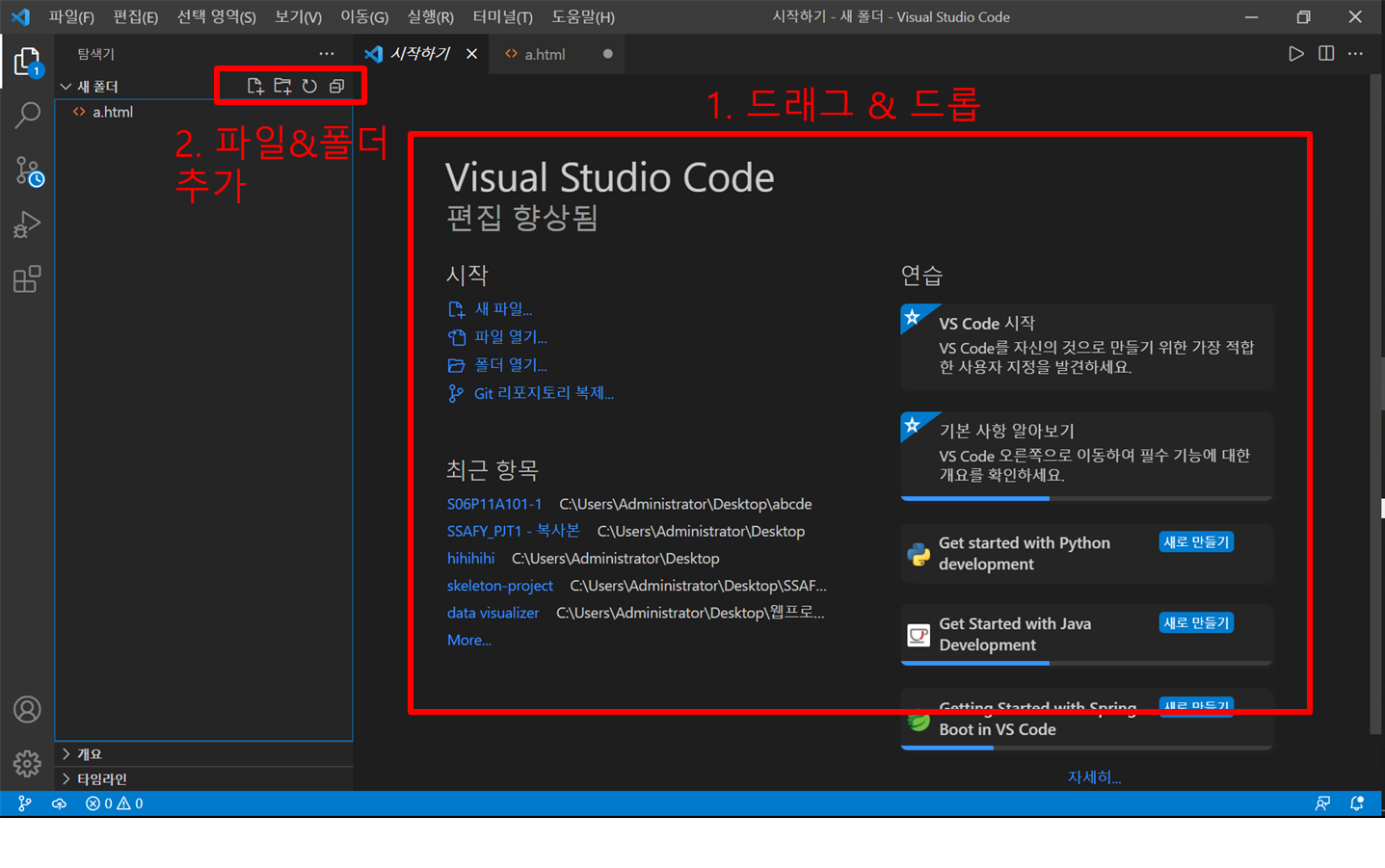 - 바탕화면 등 원하는 곳에 '새폴더'를 생성해, 다음 기본화면 (시작하기 탭)에,