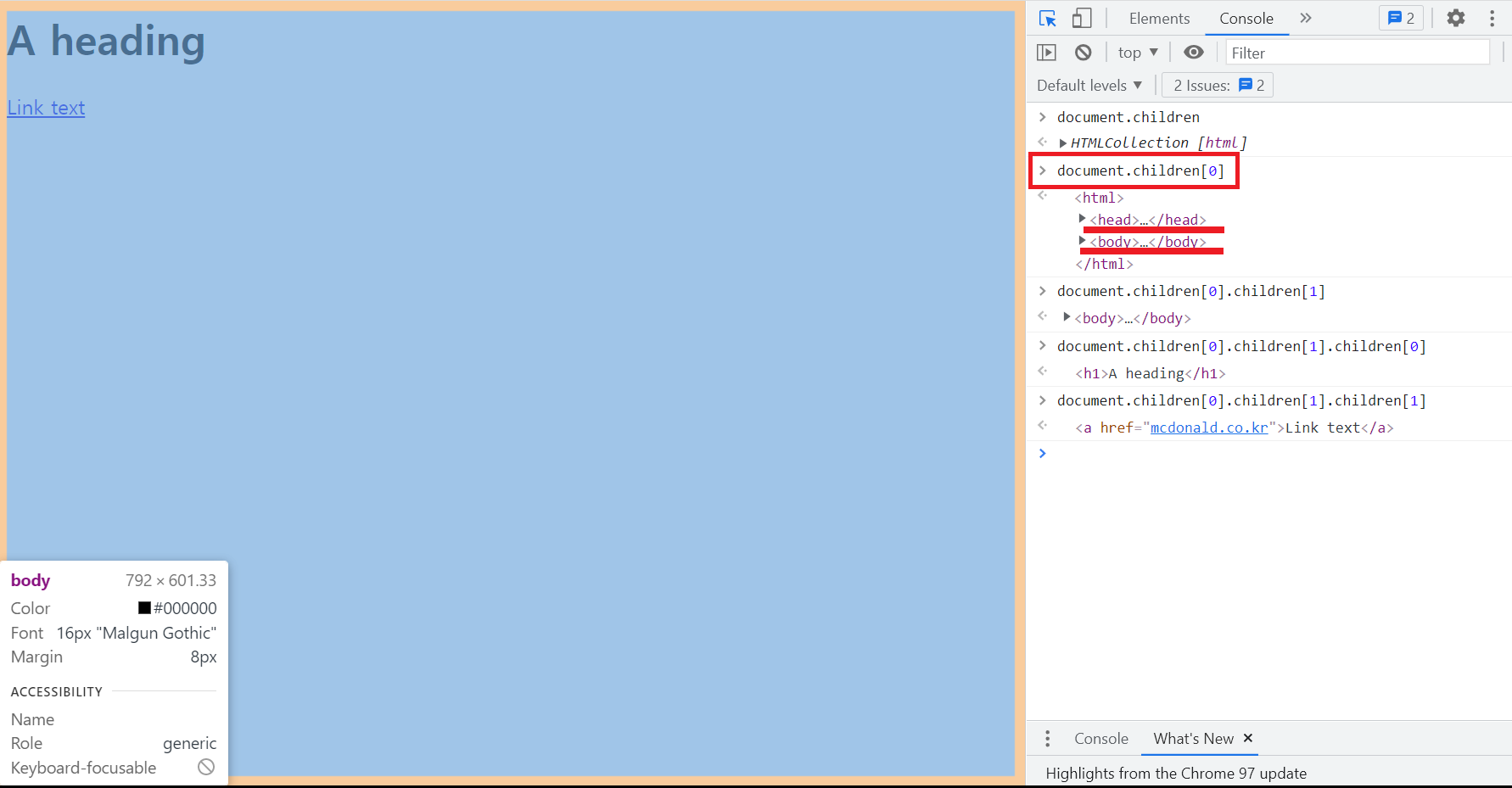 위 코드는, document의 .children[0], 즉 0 번째 자식 = <html>